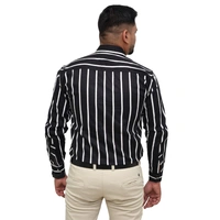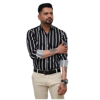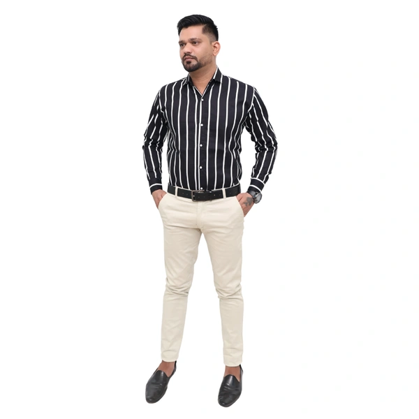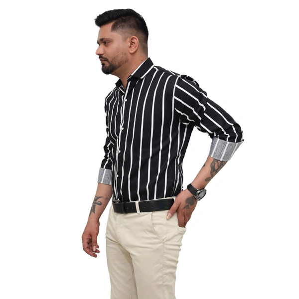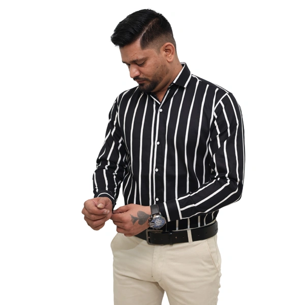 Make a bold style statement with this black and white striped formal shirt from Look Me Apparel. Crafted from a comfortable cotton-blend fabric, this full-sleeve shirt features clean vertical stripes that enhance your height and silhouette. Its slim fit and sharp spread collar make it a perfect choice for business meetings, office wear, or semi-formal occasions. Match it with beige or light-colored trousers for a striking look.