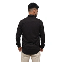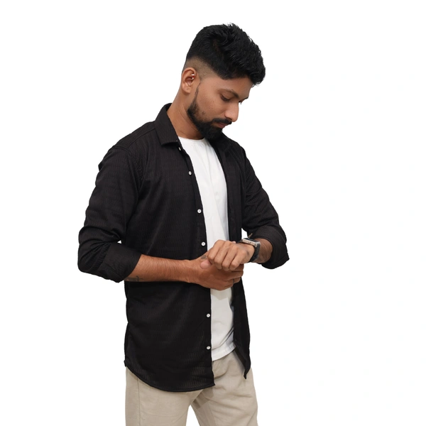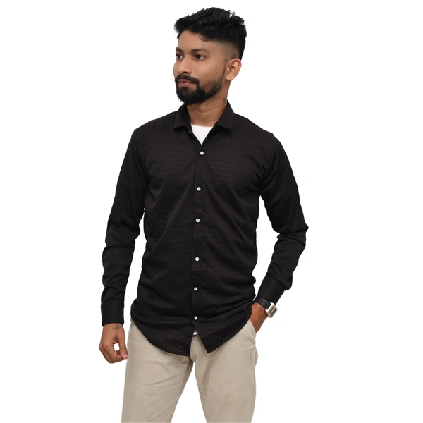 Elevate your formal style with this solid black full-sleeve shirt from Look Me Apparel. Crafted for the modern man, this shirt blends comfort with sophistication. Made from a high-quality Lycra-cotton fabric with a refined textured finish, it ensures all-day comfort and a sharp look. The smart fit enhances your form while allowing ease of movement. Ideal for office wear, client meetings, or formal events, this shirt pairs perfectly with trousers or chinos for a classic statement.